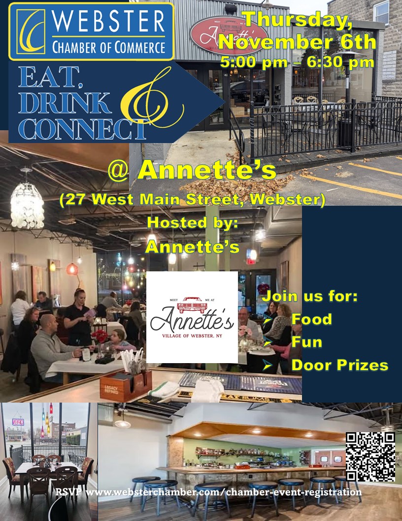 Eat Drink & Connect Thursday, November 6th at Annette's (27 West Main Street, Webster) fom 5:00 pm - 6:30 pm