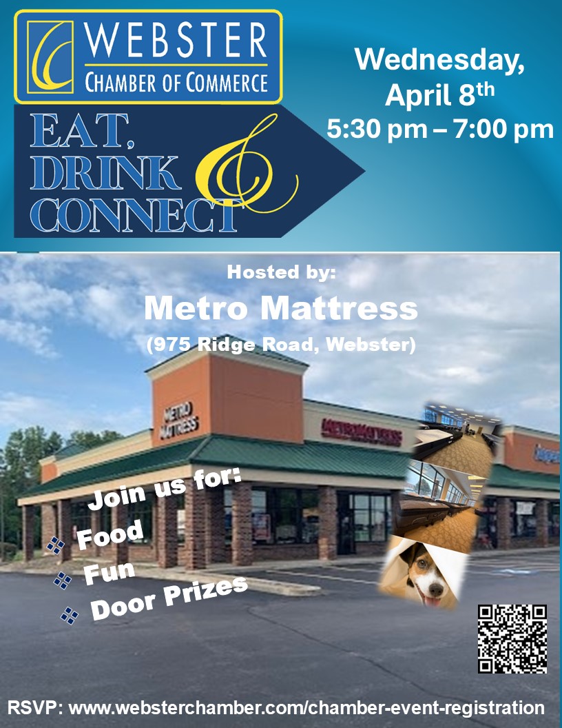 Eat Drink & Connect - Wednesday, April 8, 2026 at Metro Mattress (975 Ridge Road, Webster) from 5:30 p.m. - 7:00 p.m.